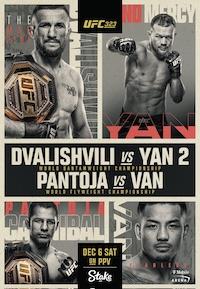 О турнире: UFC 323: Dvalishvili vs Yan 2 — планируемый турнир по смешанным единоборствам, организованный Ultimate Fighting Championship, который должен состояться 6 декабря 2025 года на спортивной арене «T-Mobile Arena» в городе Лас-Вегас, штат Невада, США.