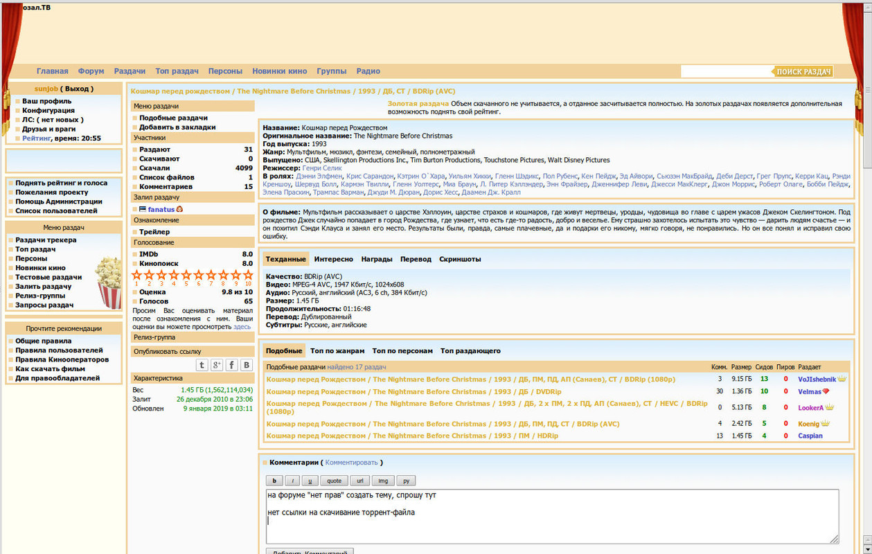 согласна-на вкус и цвет!когда только увидела на Ютьюбе отрывок из мульта(искала что-нибудь про Хэллоуин)-просто вся "затряслась"-так хотела посмотреть и до сих пор это один из любимейших мультов Бёртона,все его фильмы-суперские!но на любителя.:)спасибо за раздачу,да еще на языке оригинала.